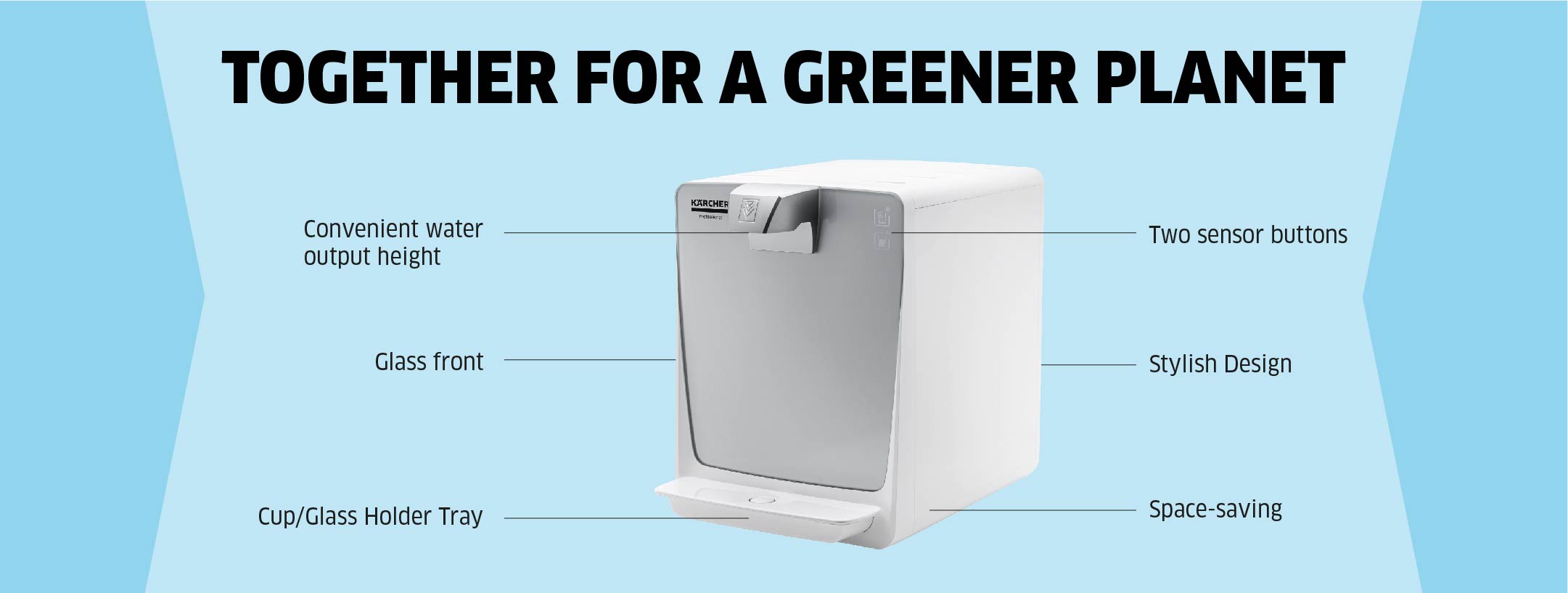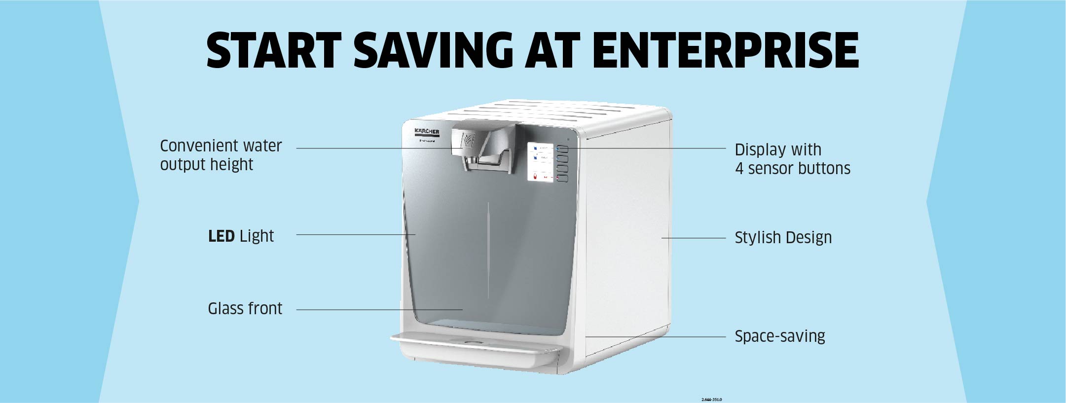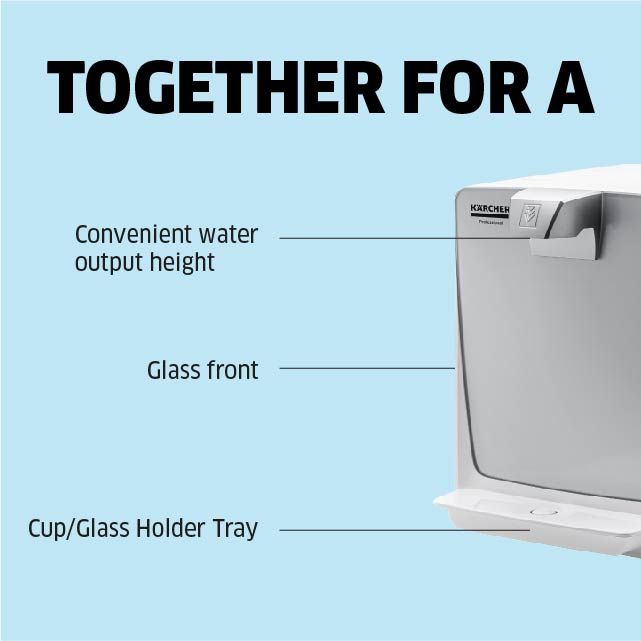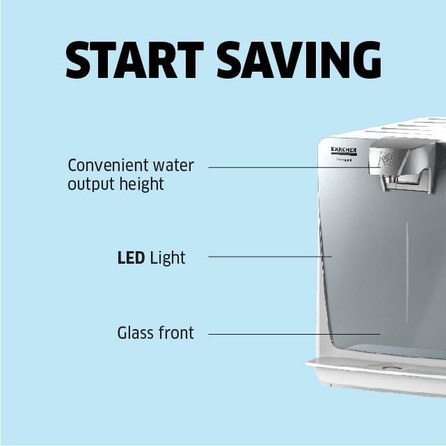Our water dispenser WPD 200 supplies chilled and ambient still water for up to 100 people. The water is filtered either using an Active-Pure or Hy-Protect filter from Karcher. Useful energy-saving functions (energy-reduced and stand-by modes) are also included.